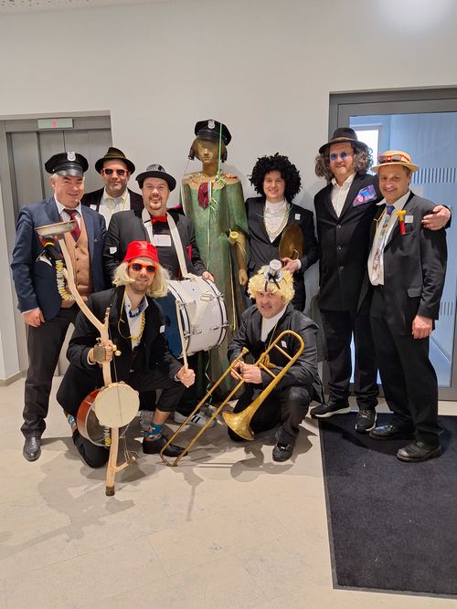 Auch in diesem Jahr besuchte die „Blitzkapelle“ der Faschingsgesellschaft am Unsinnigen Donnerstag Bürgermeister Ludwig Greimel und die Beschäftigten im Veldener Rathaus. Mit alten oder ungewöhnlichen Instrumenten sorgten die Musiker mit eher schrägen Tönen für Spaß und Unterhaltung, wofür sie natürlich mit einem Schnapserl belohnt wurden. Im Laufe des Tages wanderte die „Blitzkapelle“ durch Velden und besuchte die Geschäftsleute und gute Freunde. Es handelt sich um einen schönen und althergebrachten Brauch in Velden, der zum Glück jedes Jahr wieder stattfindet.