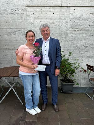 Der Markt Velden dankt Anita Waldinger für Engagement und überreicht ihr als Anerkennung ein kleines Geschenk und Blumen.