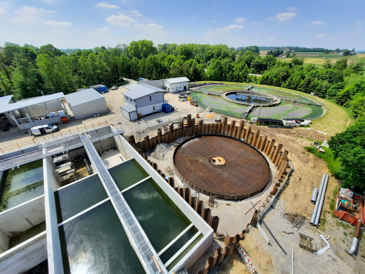 Der Bauverlauf für den Umbau der Kläranlage Velden ist absolut im Zeitplan. Bis auf die Bodenbeschichtung ist das Maschinenhaus 1 und 2 fertig. Mit der Installation der Anlagenteile kann Mitte Juni begonnen werden. Ebenfalls weitgehend fertiggestellt ist das neue Schlammlager. Das Belebungsbecken ist betoniert. Hier wurde schon mit der Installation der Technikteile begonnen. Die Begehung auf dem Belebungsbecken ist ebenso weitgehend erstellt. Das Nachklärbecken wurde zum Betonieren der Bodenplatte eingeschalt und die Arbeiten für die umfangreichen Betonarbeiten laufen. Mit der Montage der Photovoltaikanlage auf den Gebäudekomplexen wurde begonnen.
